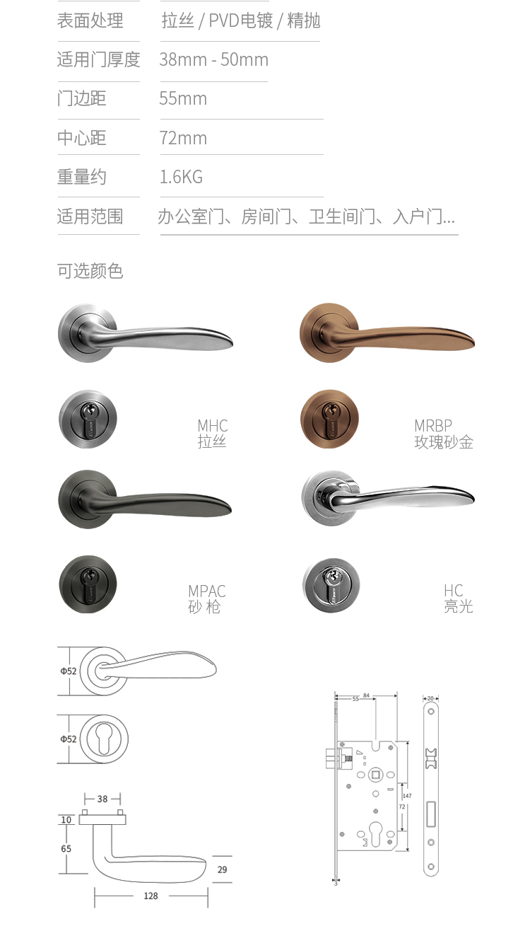 - 产品颜色:拉丝MHC、亮光HC、玫瑰砂金MRBP、砂枪MPAC