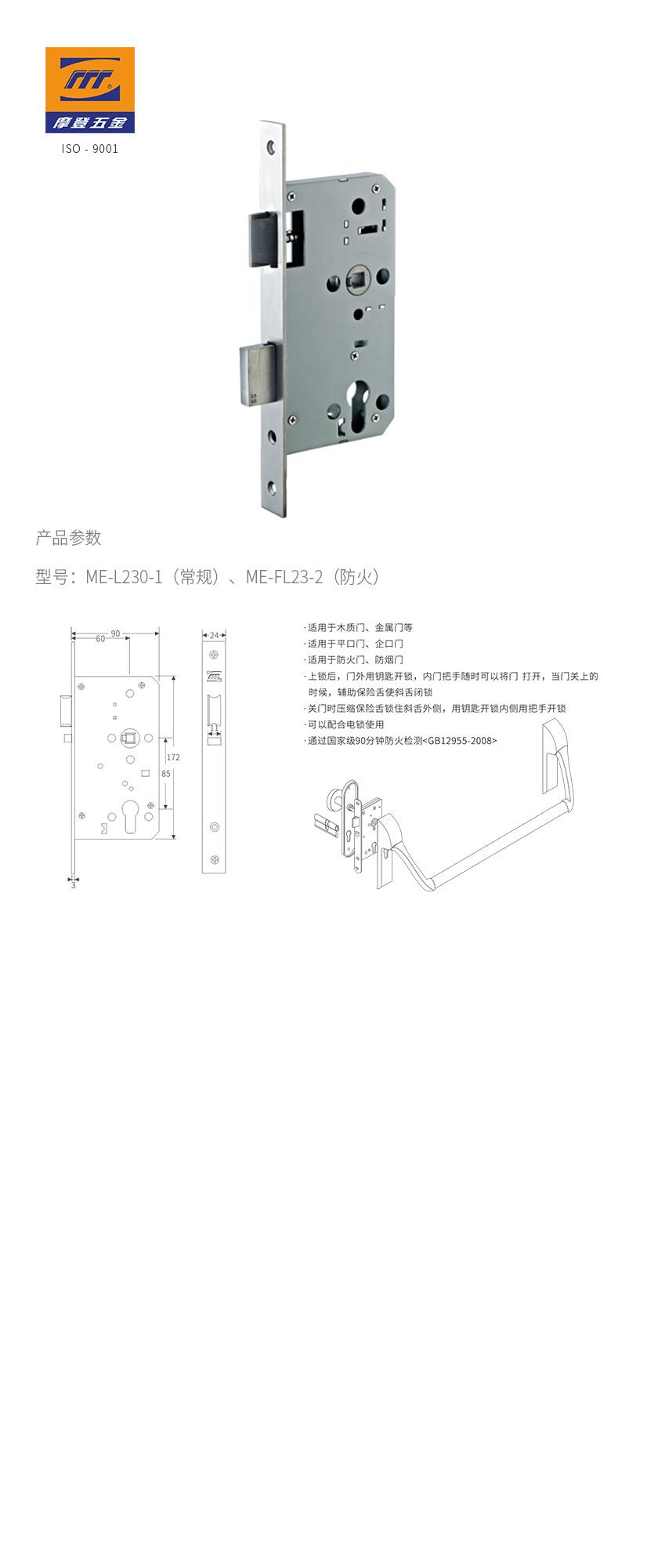 - 产品型号:欧式通道自动锁止锁体|L230-1(常规)/ME-FL230-2(防火)